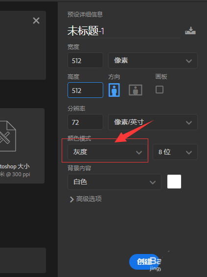 2、打开PS,新建一个512*512像素大小的灰度文档,只有这个大小的没有颜色文档才是材质纹理的文件。
