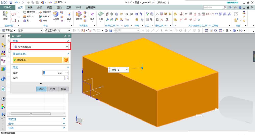 2、激活抽壳命令,抽壳类型改为“对所有面抽壳”,其他默认。