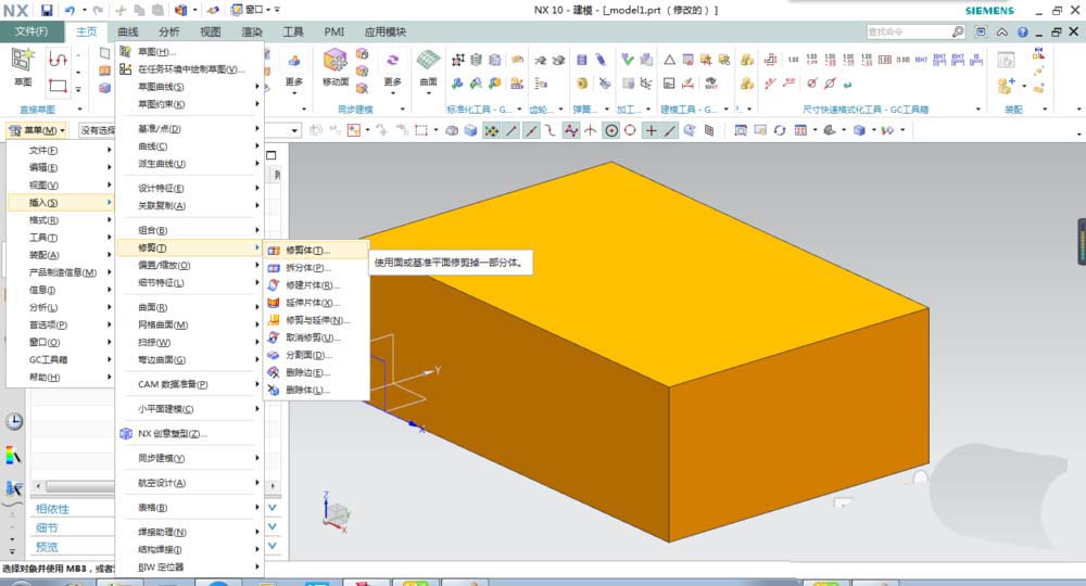 3、激活修剪体命令。激活方式:执行【菜单】-【插入】-【修剪】-【修剪体】