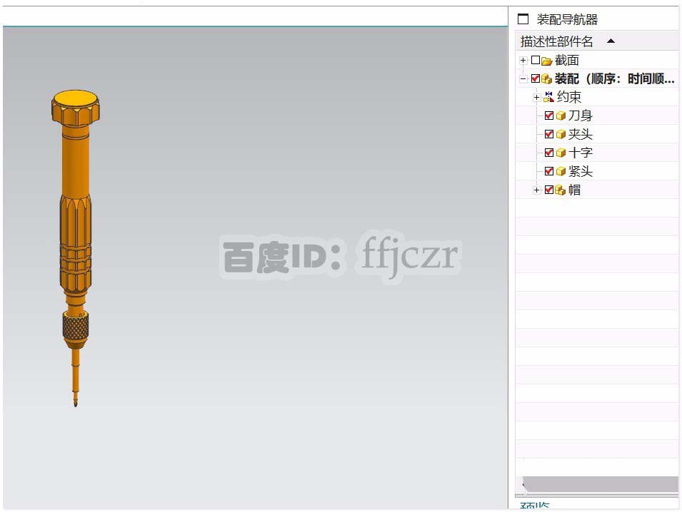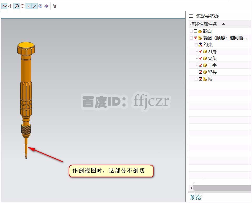 1、这里用一个简单的装配件来作说明。该装配件为组合式螺丝刀,当对装配件进行剖切时,刀头部分是不用剖切出来的。