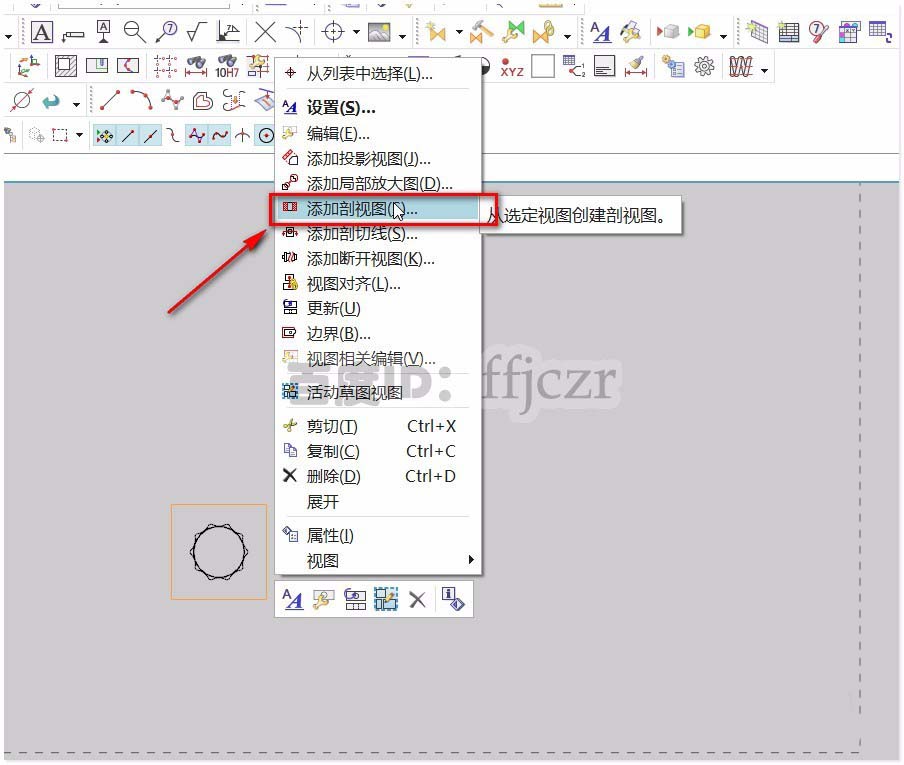 3、在生成的俯视图图框处点右键,在弹出的对话框中选择“添加剖视图”。
