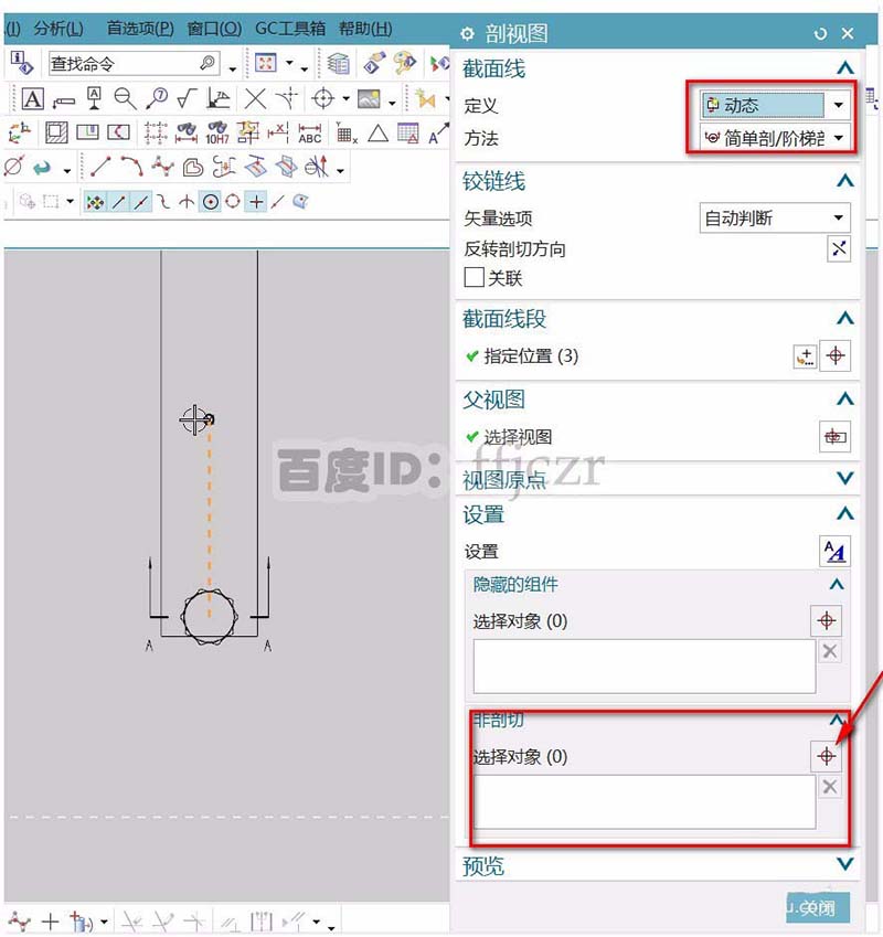 4、在剖视图对话框中,点开设置选项;在展开的选项中有“非剖切”选项。这里就是对组件剖切进行分离了。