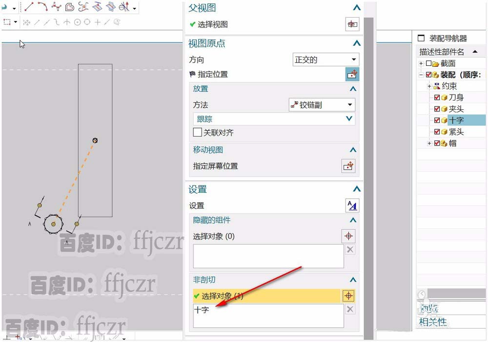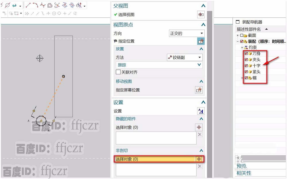 5、鼠标点击非剖切选择对象,鼠标处于选择对象状态。这时到装配导航器中选择不进行剖切的组件。点选后,组件加入到非剖切的选框列表中了。这个列表可以有很多组件。