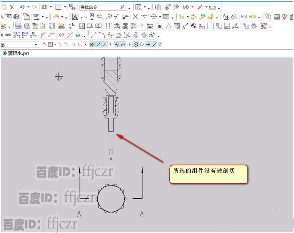6、选择完成后,点对话框中的指定位置,用鼠标确定要生成的视图所在位置即可。从图中可以看出,选为非剖切对象的螺丝刀头没有被剖切。目的达到啦!