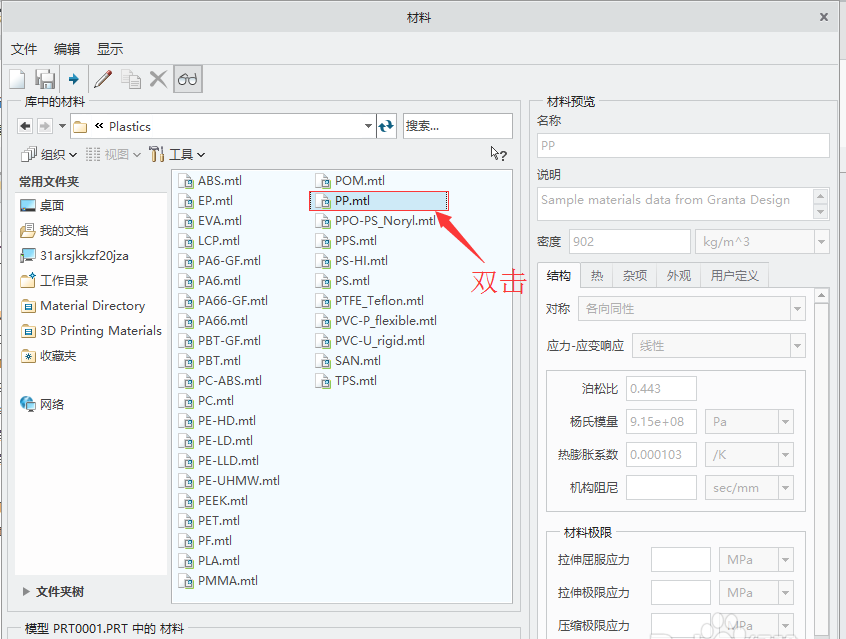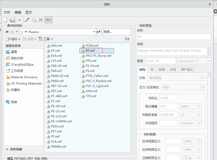 4、在弹出的”材料“对话框,在材料目录选择材料。(比如我选择PP材料,材料路径为:Material Directory →Standard-Materials_Granta-Design→Plastics 然后选择PP.mtl)