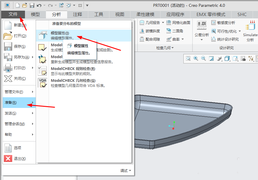 2、单击“文件”,在弹出的快捷菜单单击选择“准备”,再单击"模型属性“。
