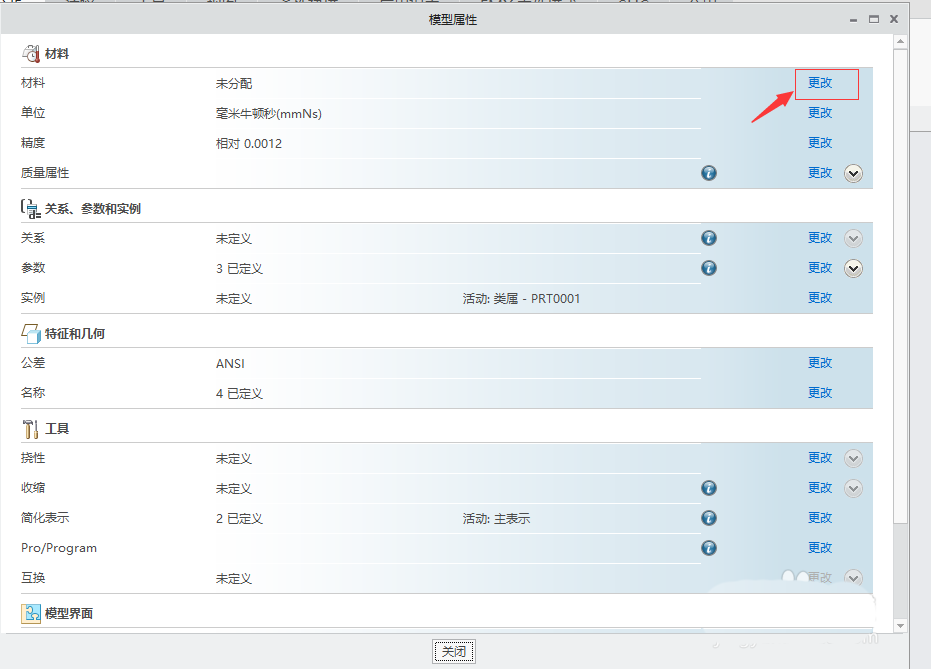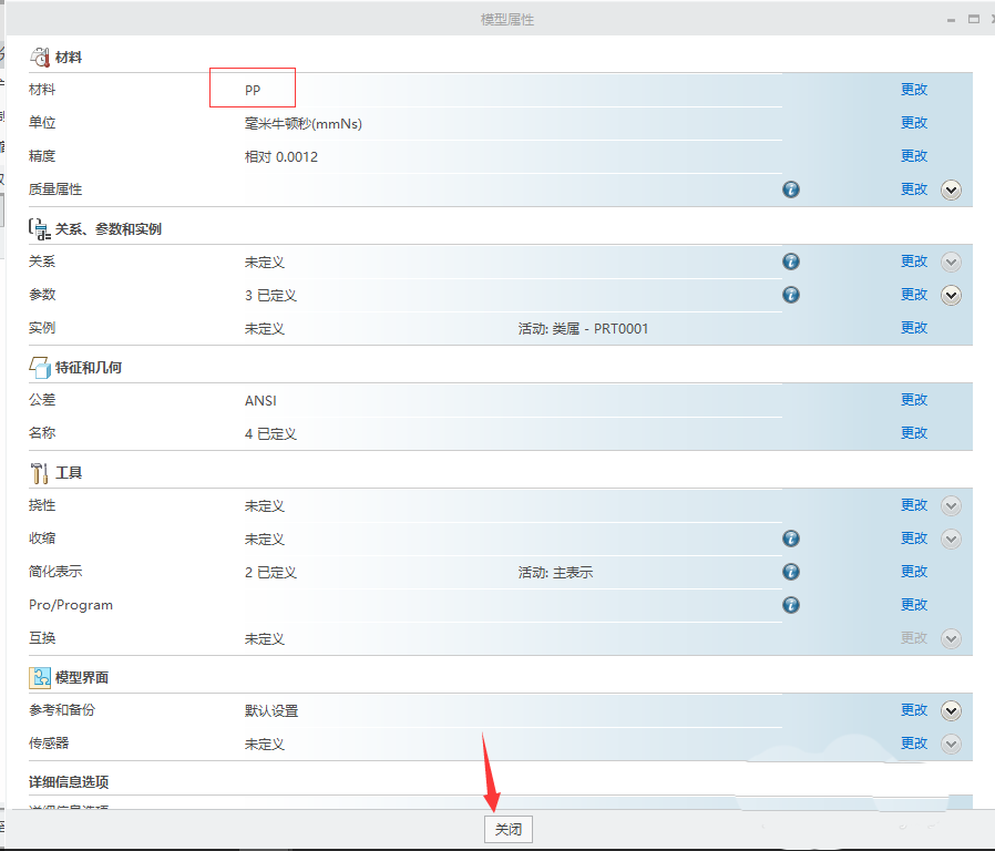 6、回到“模型属性”对话框,可以看到材料已经被设置为“PP”。关闭”模型属性“对话框。