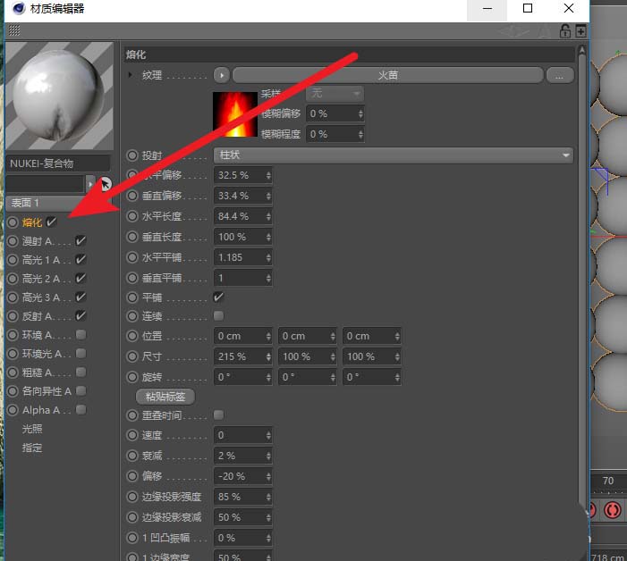 4、打开材质编辑器,可以看到独特属性--熔化,各位可以选择调节一下,适当放一些纹理;