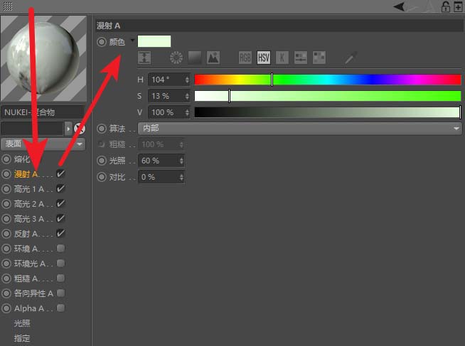 5、漫射属性比较重要,更改颜色可以改变漫射光;