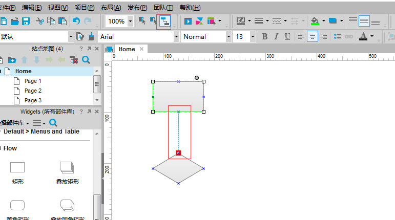 2、从左侧选择元件,比如矩形或者菱形,拖放到右侧,即可添加到页面画布中。