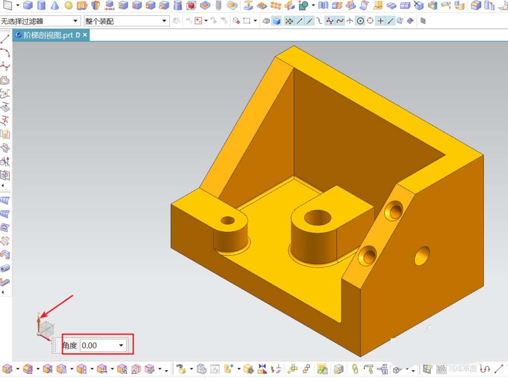 4、我们不用重建基准坐标,只要将世界坐标的相应轴旋转一个角度,就可以得到正等测图的另一个视角了。在这里,只要旋转世界坐标的Z轴,即可得到不同的正等测图视角。鼠标点一下世界坐标的Z轴,会在旁边弹出一个角度对话框。在对话框内输入90度,世界坐标就以Z轴为轴心旋转了90度,这正是旋转了90度后的正等测图。内部结构可清楚表达。正是所需!