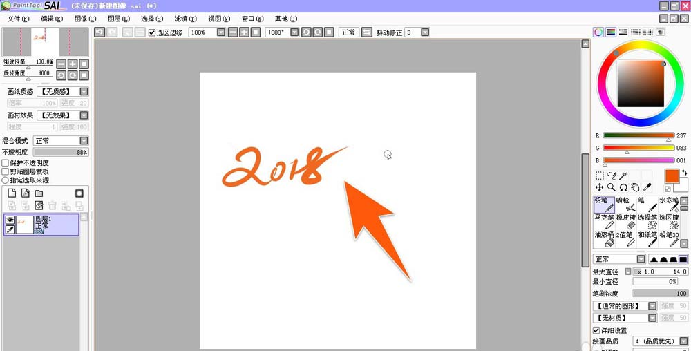 1、如使用sai中,怎样去调一个图像和图层的透明度,为了示范,先用画笔,在画布上画上一个图形,默认画出来的是没有透明度的,如下图所示。