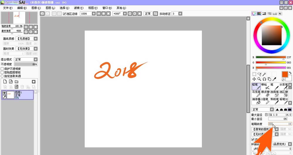 2、这时,为了要增加画出图像的透明度,那么可以在面板的下方有一个笔刷的浓度,在后面有一个灰色的拉条,用鼠标左右拉动这个灰色条,就可以控制画笔画出后的透明度了。