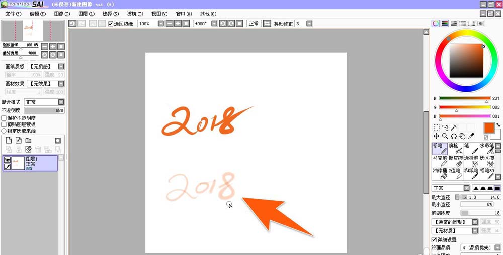 6、另外,如果用的是不彩画笔,要调整画图时的图像透明度,那么就可以通过拉动那个灰色条,增加水分量,也能实现图像透明度调整后的效果。