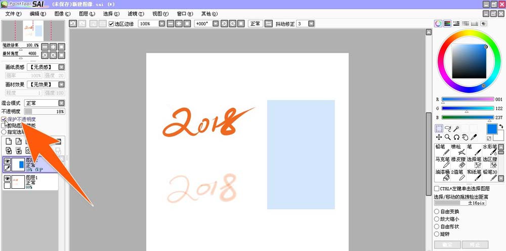 5、如果要设置sai的保护不透明度,那么直接选中该图层,然后点击上方的那个保护不透度前的那个框,把此项勾选中就可以了。