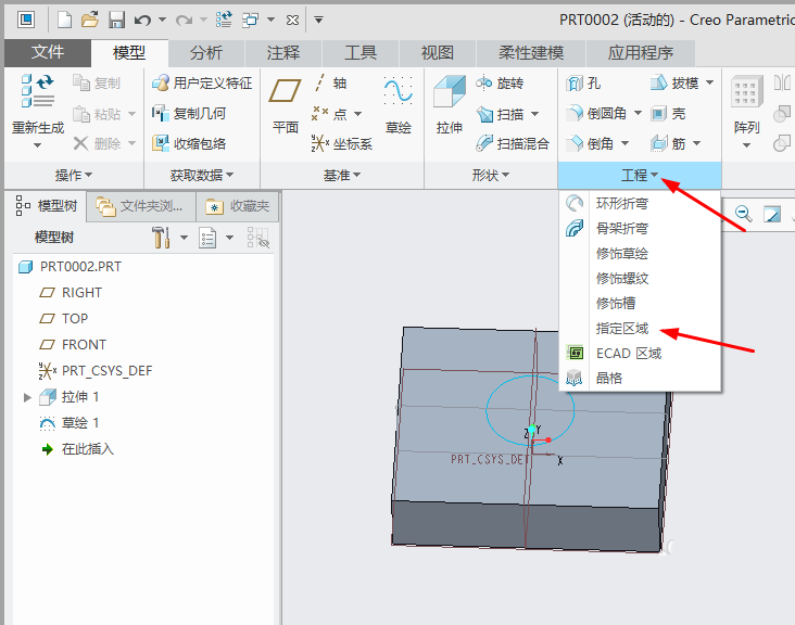 2、单击“模型”功能卡“工程”区域的下拉按钮,单击“指定区域”。
