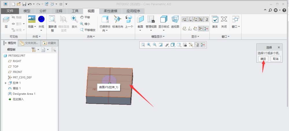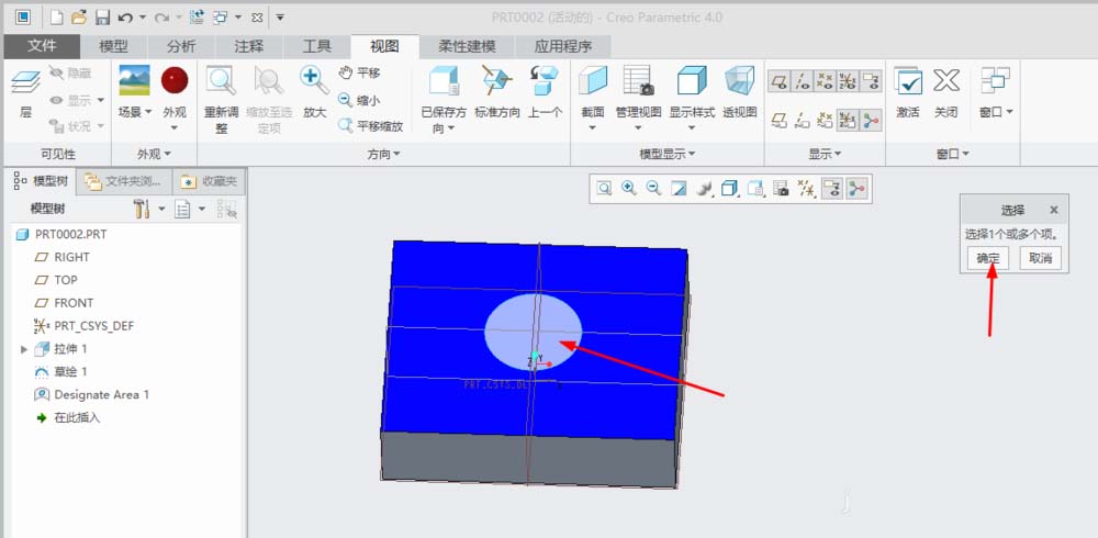 7、单击选中模型表面圆圈外面。单击”选择"对话框中的“确定”。