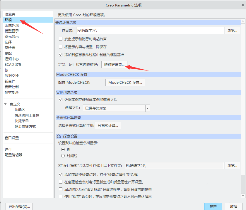 3、在弹出的“Creo Parameteic选项”对话框左侧找到并单击“环境”。在右侧“普通环境选项”栏找到并单击“映射键设置”。