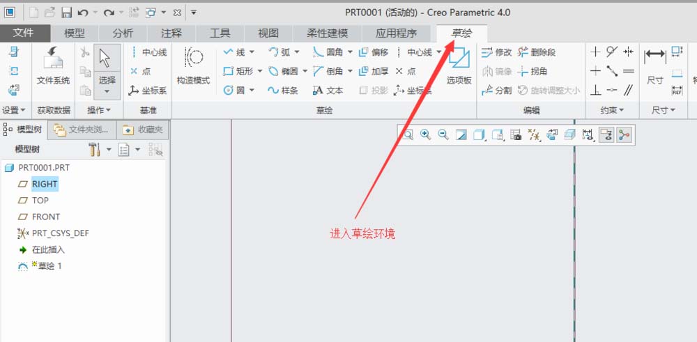 1、打开creo4.0软件,为了好举例,新建一个建模文件并进入草绘环境。如下图: