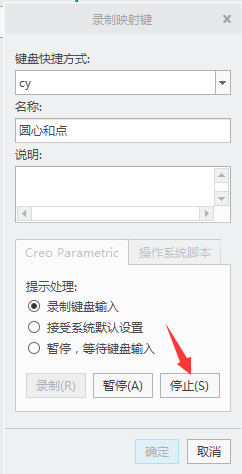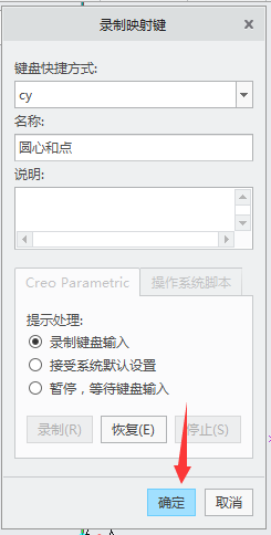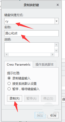 5、在“键盘快捷方式”栏输入快捷键(比如:cy),在“名称”栏输入名称(比如:圆心和圆),单击“录制”按钮。