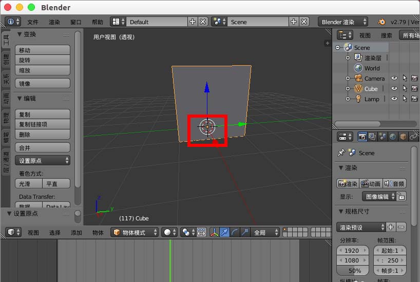 3、保持游标是在中心位置立方体的底部,然后我们shift+ctrl+alt+c选择 原点->3D游标,让原点到立方体的底部中心位置。