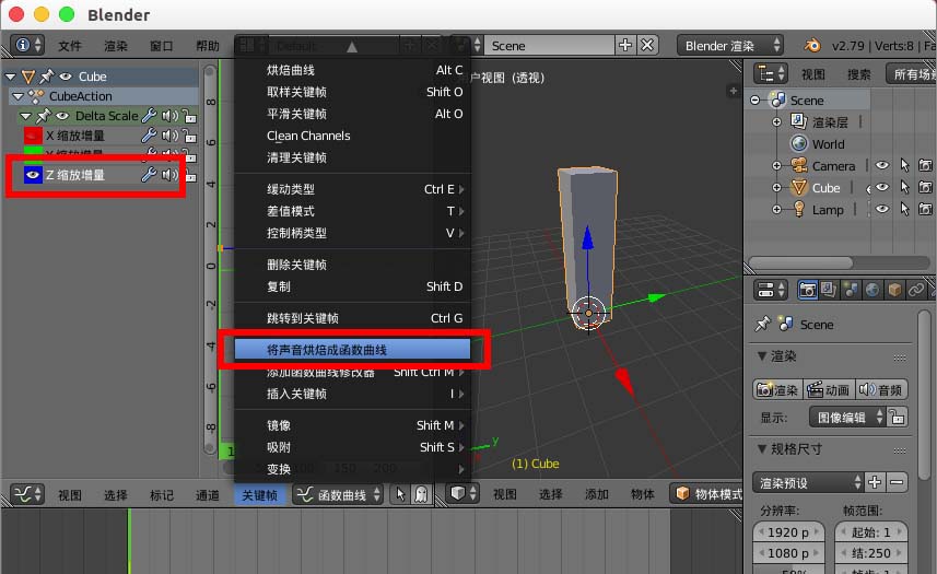 8、选择 Z缩放增量 底部菜单 关键帧--将声音烘焙成函数曲线。