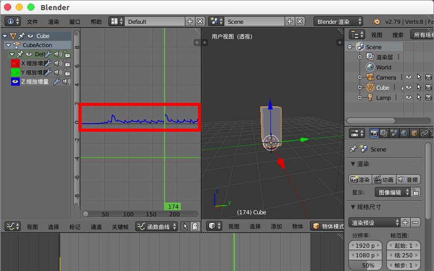 10、现在我们发现动画曲线已经生成了,移动底部的时间轴可以查看到立方体频谱动画的效果。