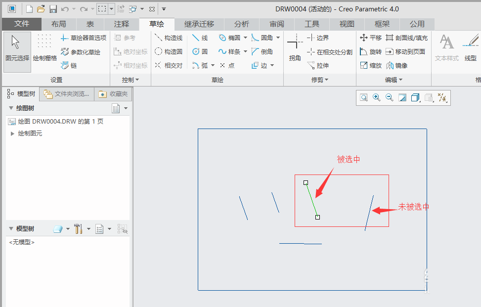 4、从左到右用鼠标选取后,在框内的直线被选中。穿过框的直线未被选中。
