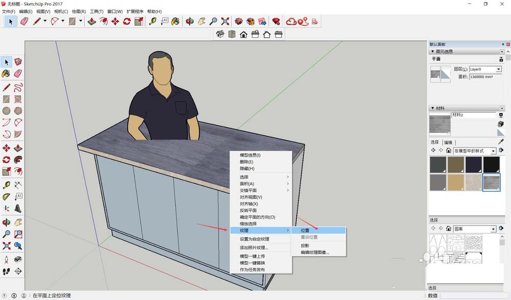 6、右击材质,选择“纹理”—“位置”,在弹出的调整轴上面进行操作。一般拖动绿轴,是改变平面上材质的长宽比例,黄轴和蓝轴则会让材质发生变形或扭曲。