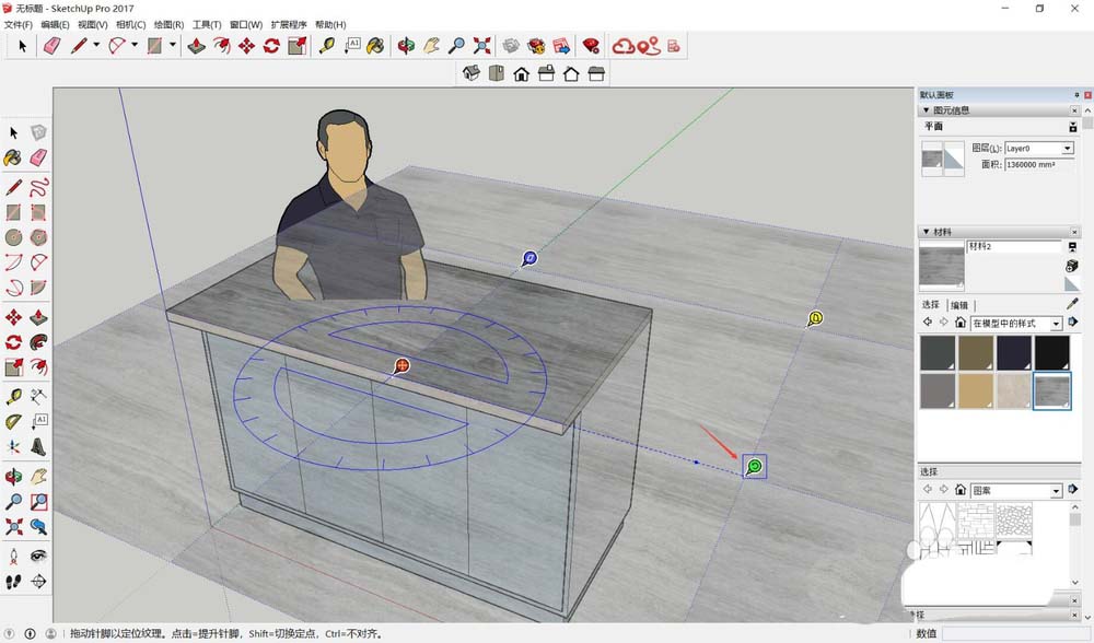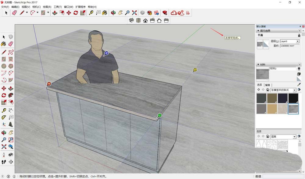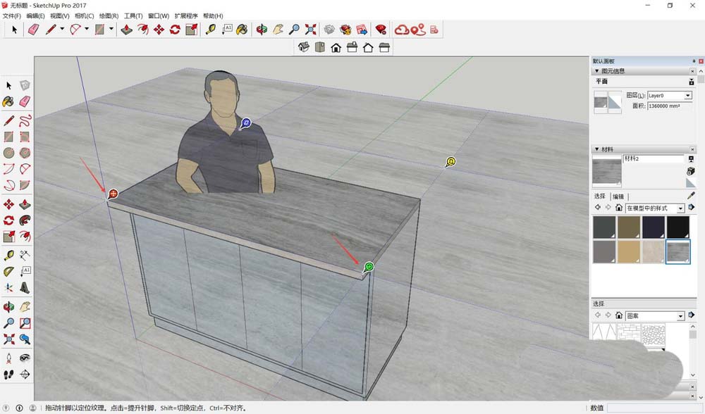 7、调整好之后,可以重新定义材质的起铺点,将红轴移动到台面的一个端点,拖动绿轴,使材质刚好满铺在红绿轴之间,占满整个台面。点按材质外的其它区域,即完成材质的调整。