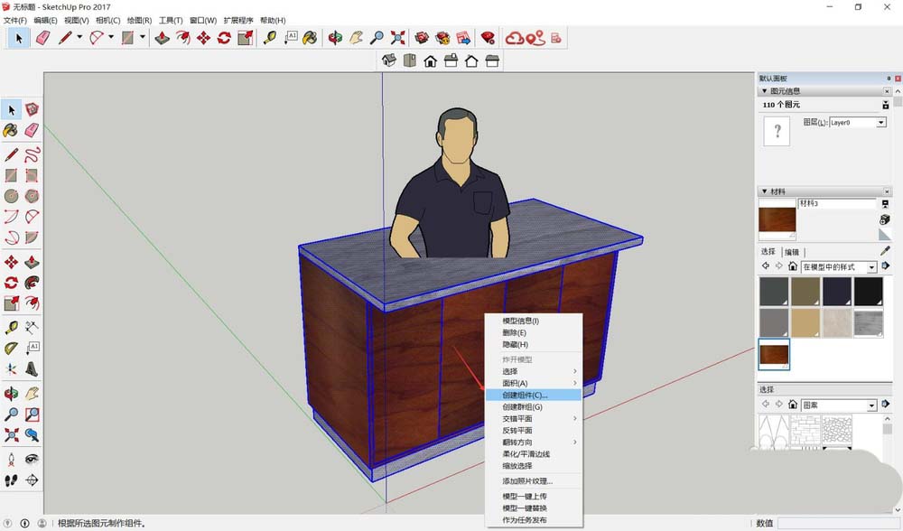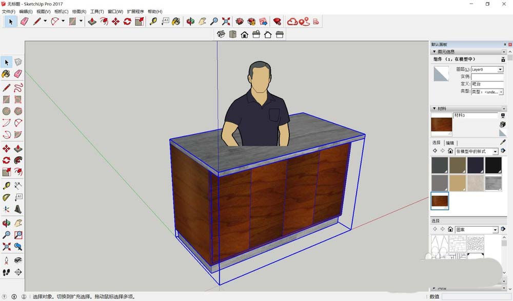 9、使用同样的方法,创建材质,给吧台的柜体铺上木饰面。做好了之后,可以选中全部,建一个组,方便以后调用。