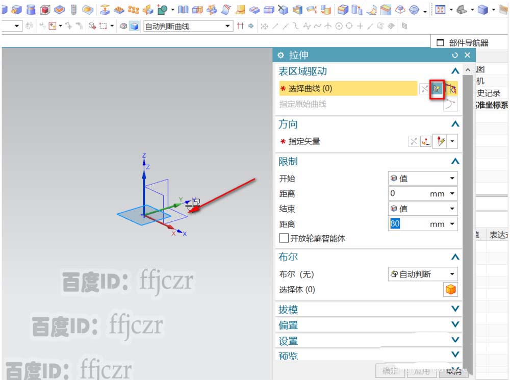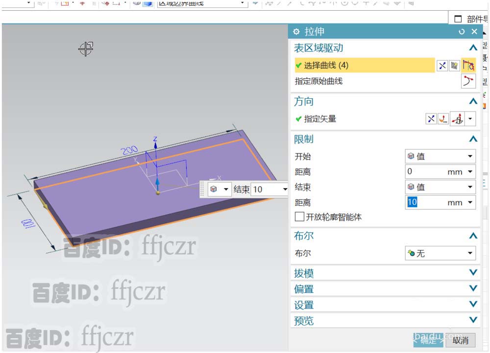 1、首先,创建底座。选用拉伸命令,直接采用拉伸中的草图绘制截面线,以XY为草绘平面。绘出一个200*100的长方形,这就是底座的截面了。完成底座的截面绘制后,在拉伸对话框中;修改拉伸高度为10.得到底座的模型。