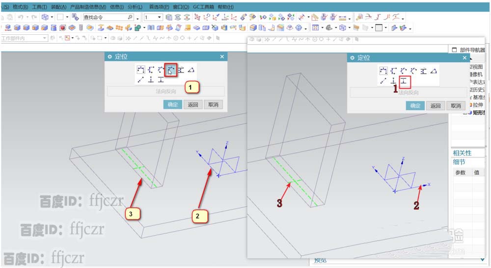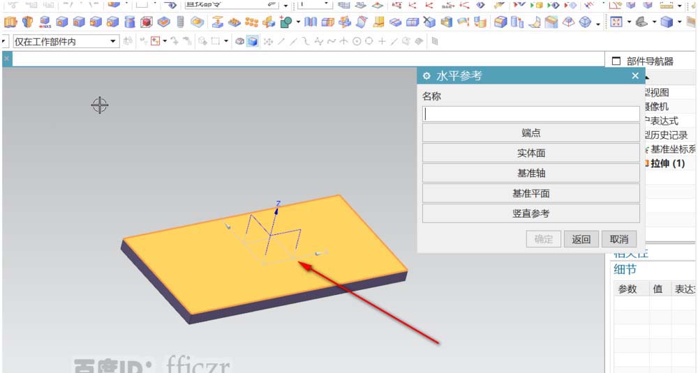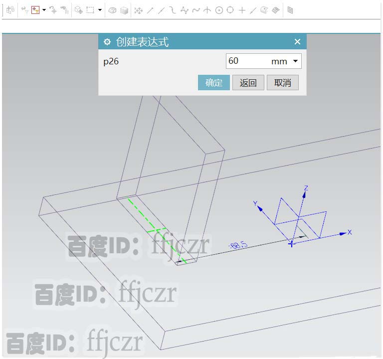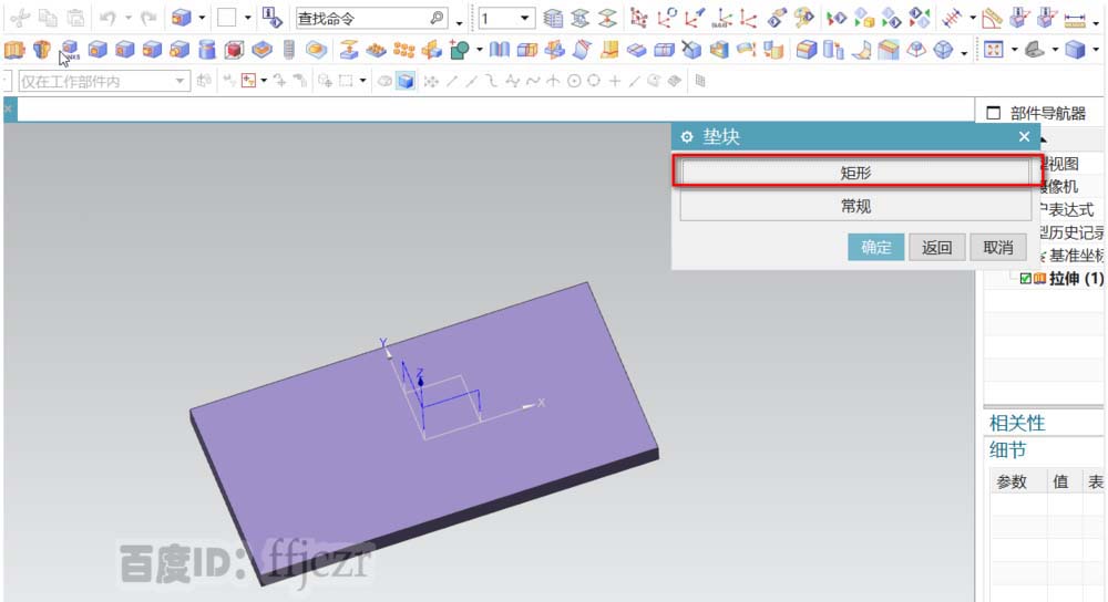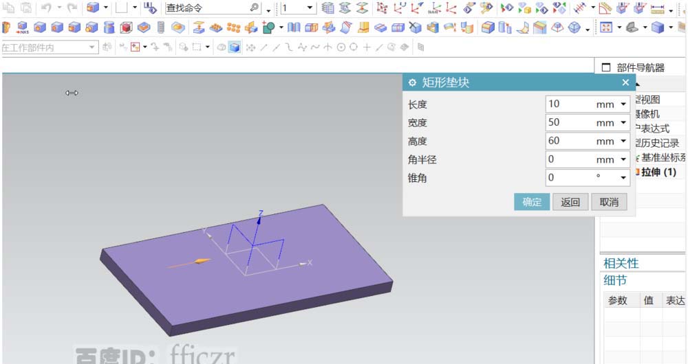 2、选用垫块命令,选择底座的上表面为放置平面,垫块的参数:长为10,宽为50,高为60。