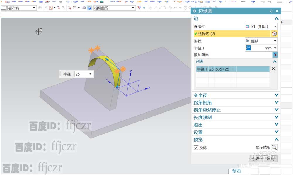 4、对垫块顶端进行倒圆角,半径为25。