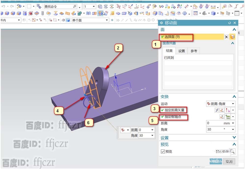 6、选用同步建模的移动面命令;选择要移动的面时,要全部选中垫块;矢量方向为Y轴,定轴点为垫块与底座相交的角点,如图所示。移动的距离为0,角度为30.确定后即可得到一个用同步建模工具形成的倾斜支架。