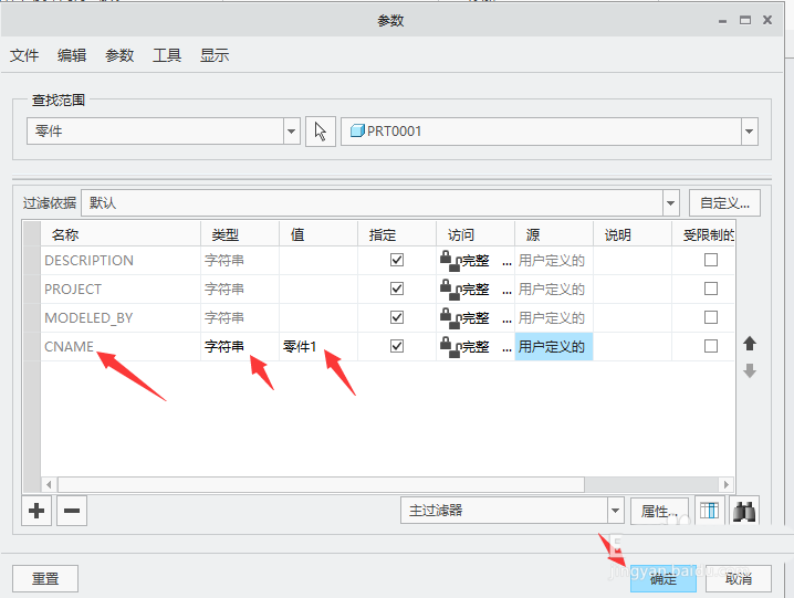 4、在名称栏输入“CNAME”,在类型栏选择“字符串”,在值栏“输入”零件名称(比如零件1)。