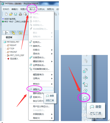 2、进入造型模块,有两种方法:一是依次点击“插入”-“造型”;二是点击工具栏的“造型”按钮。如下图所示。
