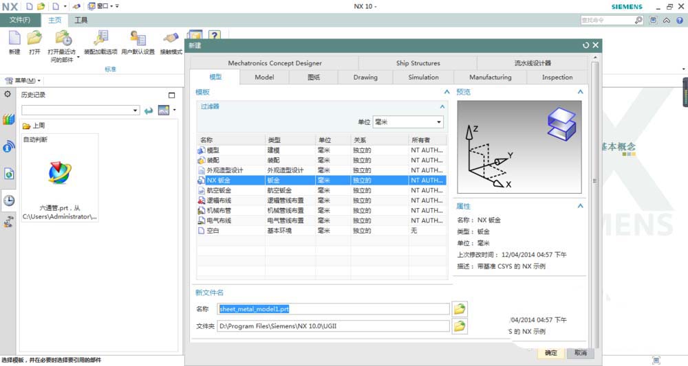 1、打开UG10.0软件,新建一个NX钣金文件。