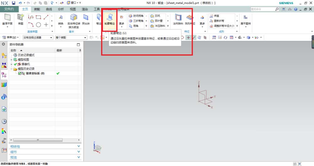 2、进入到钣金工作界面,在上面的工具栏中找到“轮廓弯边”命令图标点击它,或者执行【菜单】【插入】【折弯】【轮廓弯边】,都能激活这个命令。