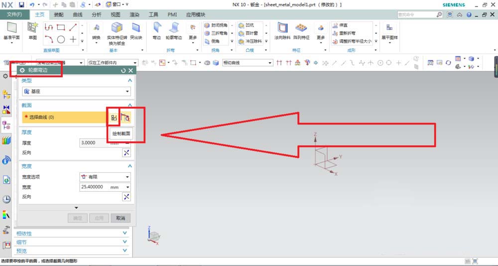 3、激活“轮廓弯边”命令之后,会弹出“轮廓弯边对话框”,见下图红色框选,点击对话框中“绘制截面”的图标。