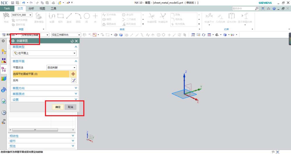 4、上一步点击“绘制截面”图标后,会出现下图所示的“创建草图”对话框,然后直接点击确定就可以了,因为草图平面选择默认。