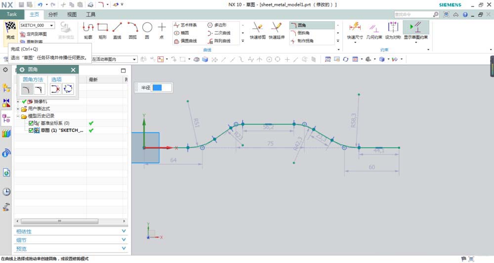 5、进入草图界面,按下图所示形状的线段,随手画一个,然后点击完成,退出草图界面,就可以了。