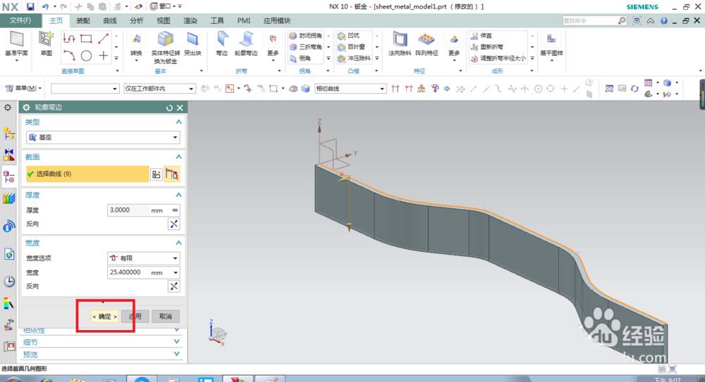 6、退出草图界面,就自动回到了轮廓弯边的对话框,在这里我们可以看到它的类型是基座,我们可以设置的参数只有厚度和宽度,为了偷懒,笔者一切参数都选择默认,所以这里我们可以直接点击“确定”