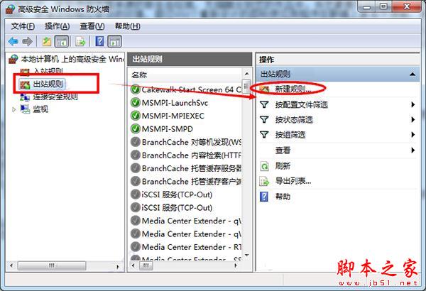 2.点击左侧栏的出站规则,然后可以看到右侧的“新建规则”按钮,点击它