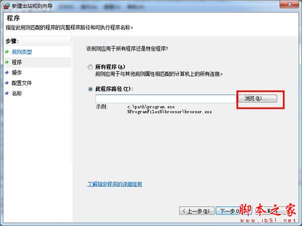 4.点击“浏览”,定位到待屏蔽联网的软件的安装目录下