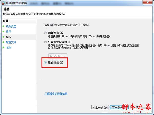 7.弹出下图所示的窗口,默认勾选“阻止连接”,也就是阻止选择的exe程序联网。继续“下一步”