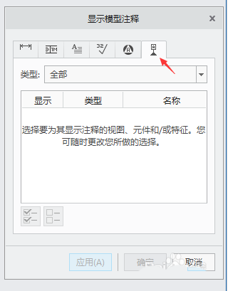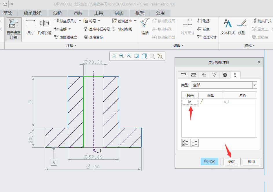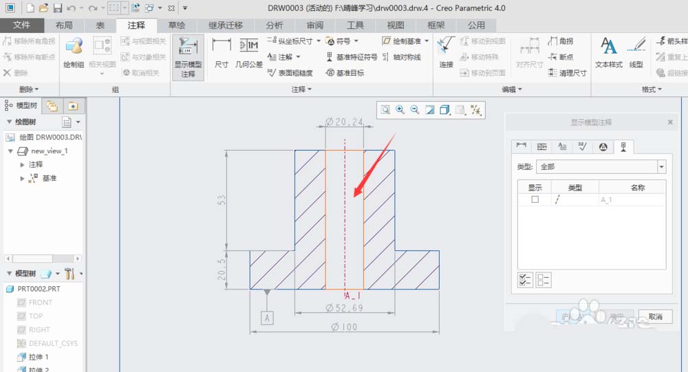 6、在“显示模型注释”对话框单击A-1左边显示栏中的复选框,然后单击显示模型注释”对话框中的“确定”。这样就创建基准轴了。