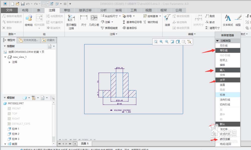 4、系统弹出球标注解"菜单管理器",依次选择”带引线“→“输入”→“水平”→“标准”→“默认“→”进行注解“。