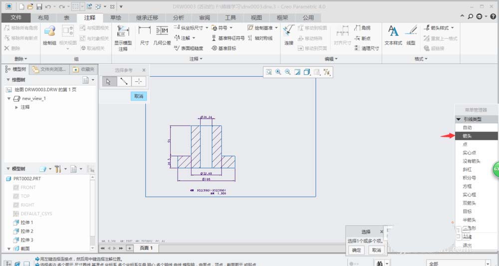 5、系统弹出引线类型”菜单管理器“,选择”箭头“。
