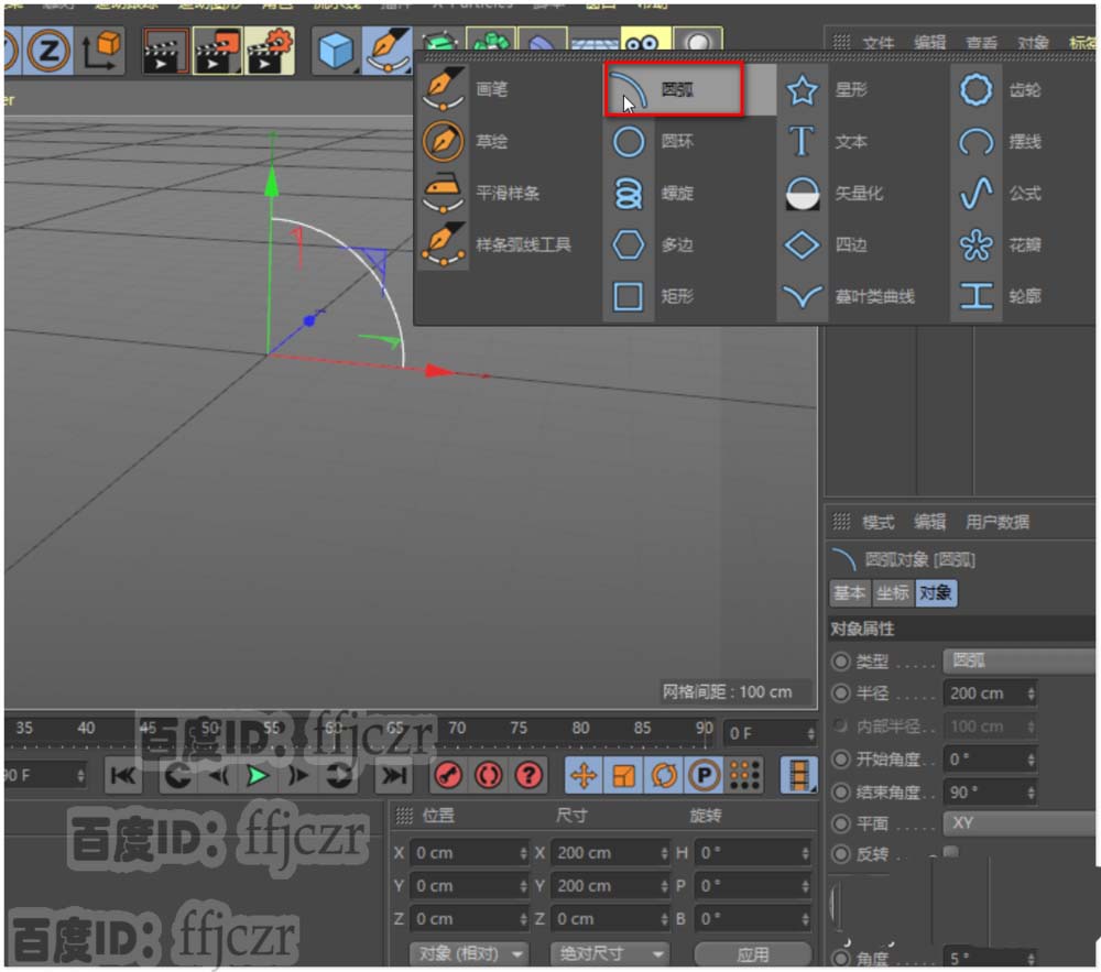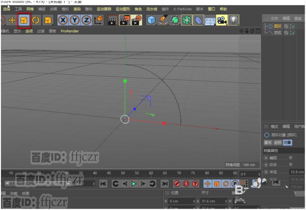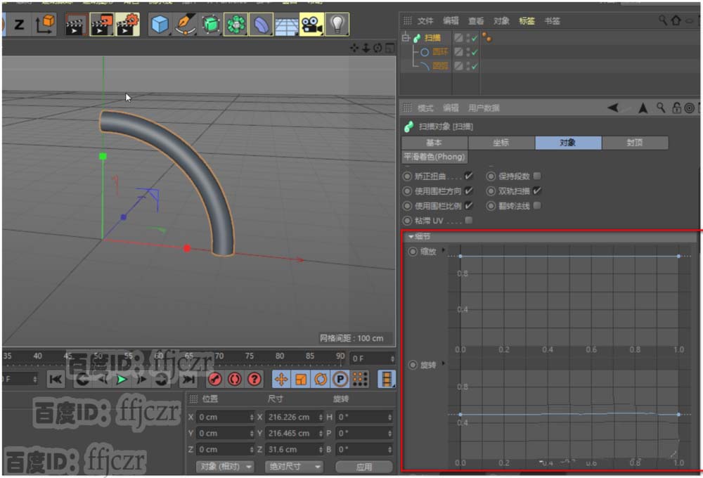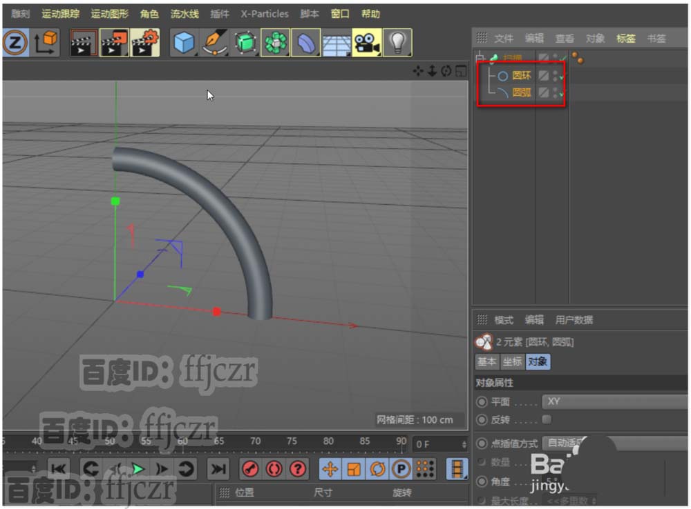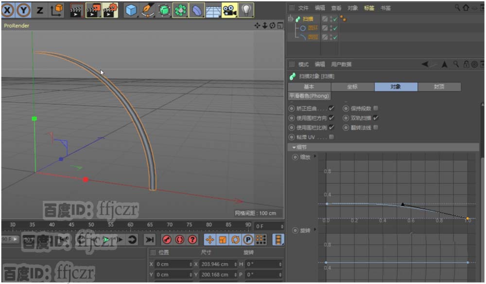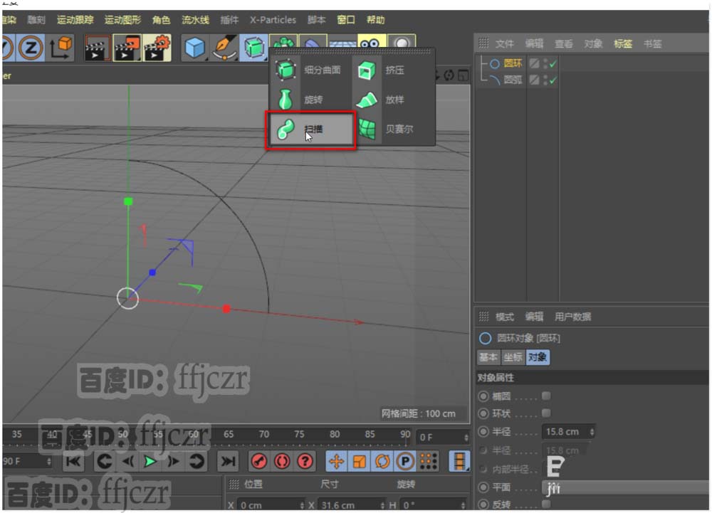 3、添加一个扫描命令。将圆弧和圆环拖到扫描的子级下,注意圆环在圆弧的上面。